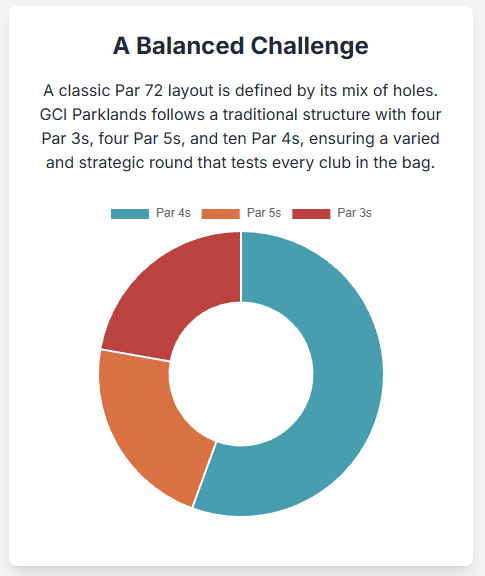 GCI Parklands is an 18-hole, Par 72 championship course, a layout considered a benchmark for high-level play. The design is balanced to provide a variety of challenges, featuring a classic distribution of four Par 3s, ten Par 4s, and four Par 5s. The course offers a range of total yardages from four distinct tee boxes, catering to players of different skill levels. The total yardages for each tee are carefully calibrated to provide a comprehensive test for their designated players, ranging from the forward tees designed for a more enjoyable round to the championship tees for professional competition.