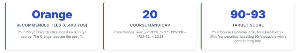 From there, we calculated his Course Handicap. With his 17.3 index, the course’s slope and rating give him a Course Handicap of 20. This means he gets 20 strokes against the course – a crucial number for setting a realistic target score and managing expectations.