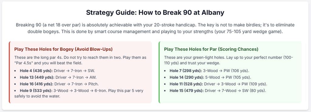 - Aim for the Middle of Every Green. With Albany’s tricky runoff areas, flag-hunting is a recipe for disaster. The strategy for every single approach shot is to aim for the center of the green. A 30-foot putt is always better than a delicate chip from a tight lie.