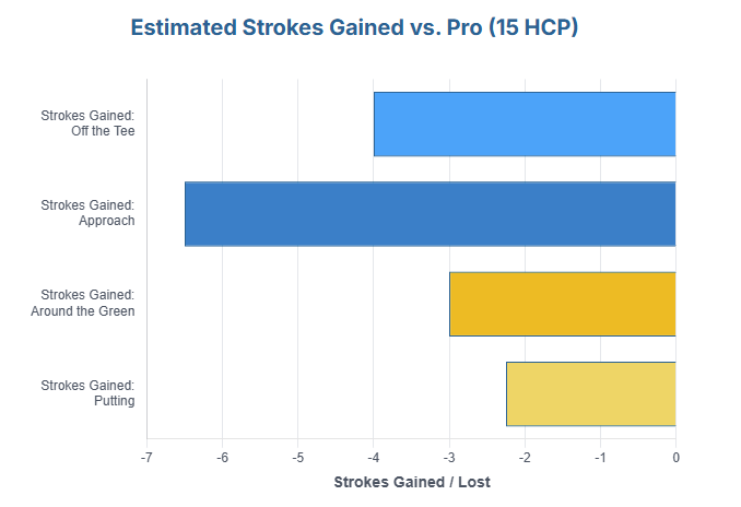For a 15-handicap, estimated Strokes Gained (vs. a pro) typically look like this: